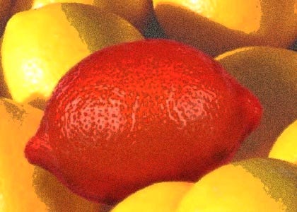Baffled, I pick it up and stare at it. Has it gone bad and this is some kind of mould? Has the colour run from something? A damp tea-towel perhaps and somehow stained it red? Is it a reflection of some kind? Have aliens landed and mutated all our lemons?