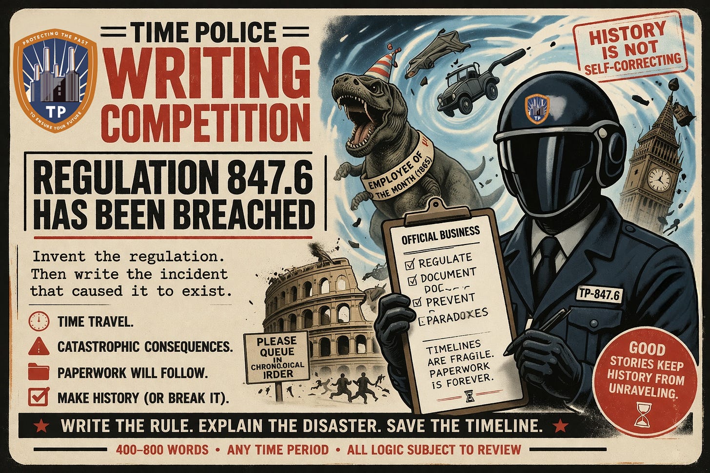 It’s time for another fun writing competition. This time we want you to invent the TIME POLICE Regulation 847.6, then write the incident that caused the rule to exist.