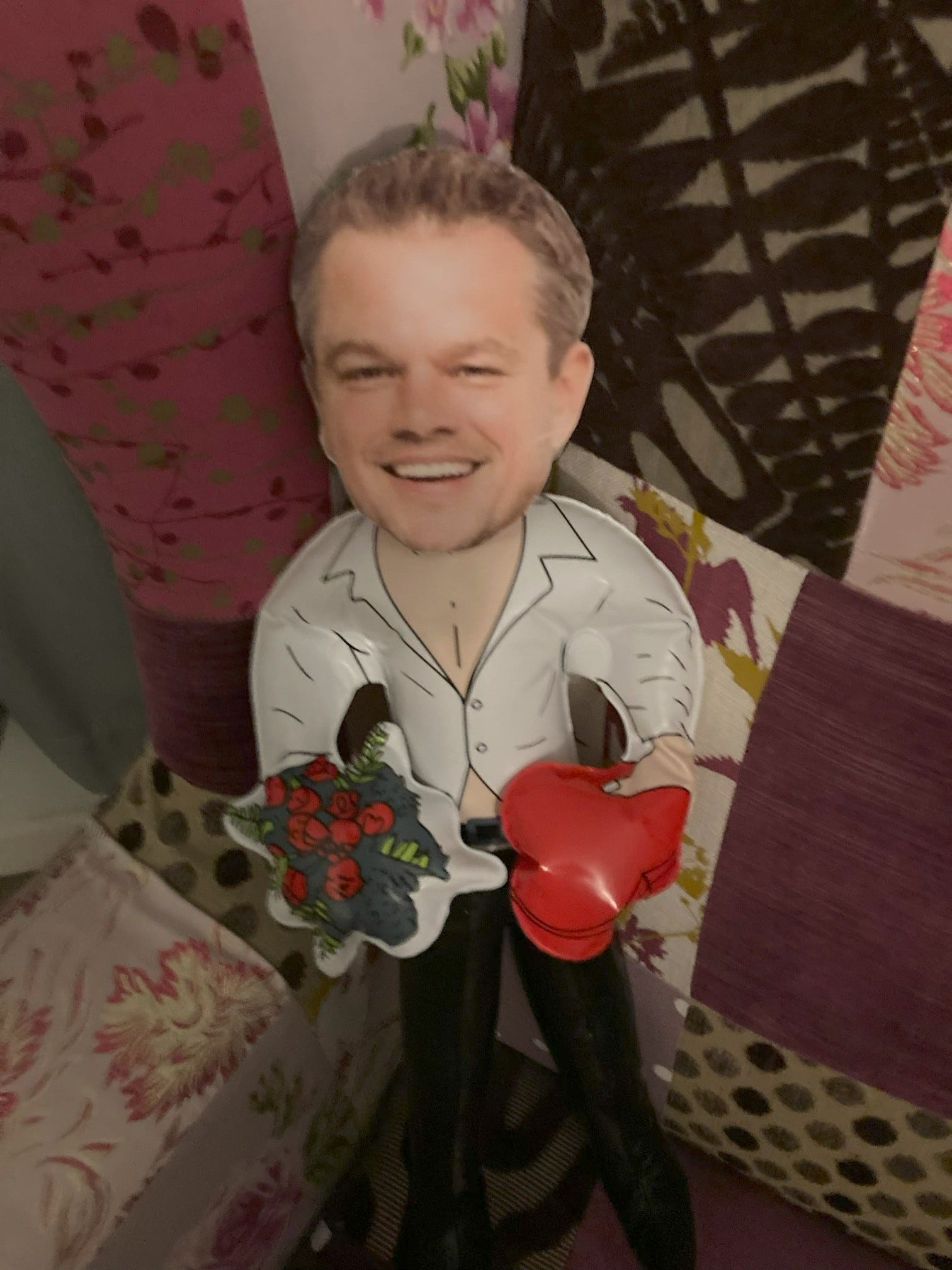 A great deal of blowing later … will you stop laughing … Matt is inflated and all ready to go. I swear I will throw buckets of cold water over all of you if you don’t calm down. He’s taken up his rightful position in the armchair in my bedroom where I anticipate sparkling dialogue and intellectual chats on the burning issues of the day. Chaperoned, obviously, by my other big pressie – Alexa. So that’s three of us in there now.